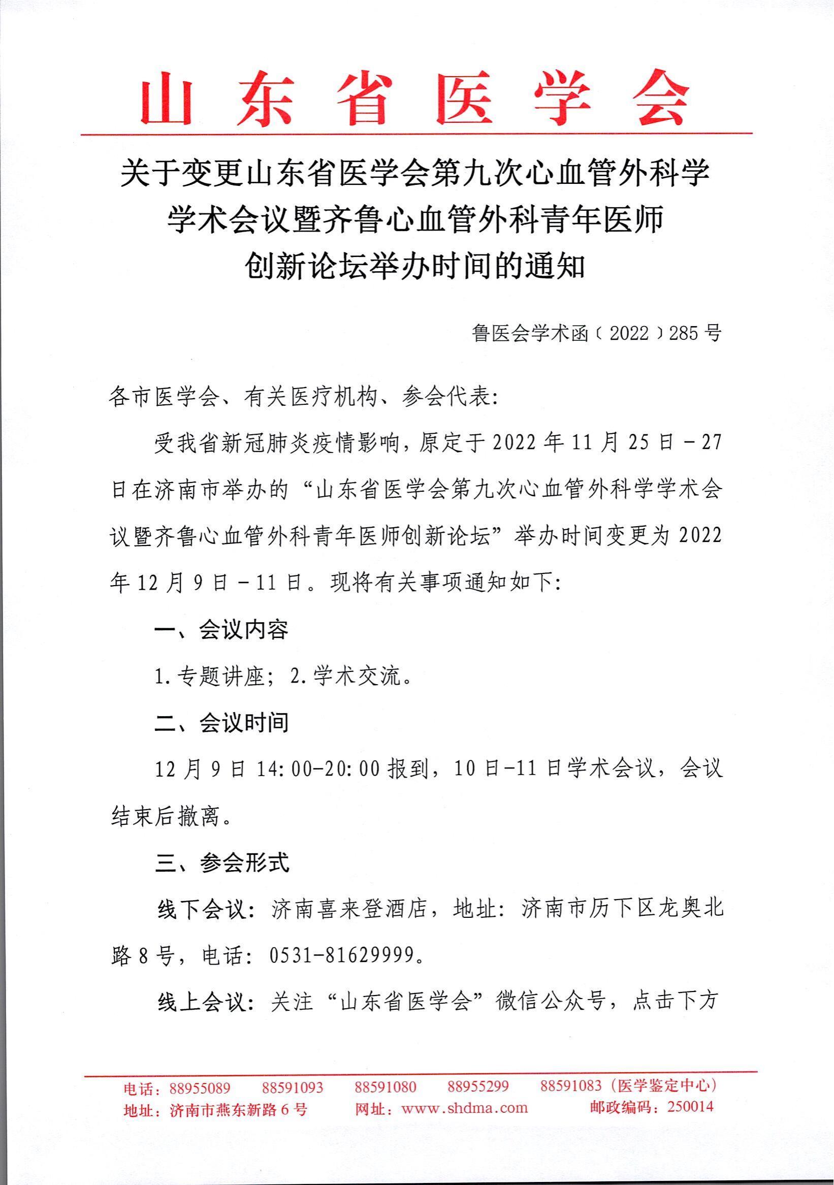 关于变更山东省医学会第九次心血管外科学学术会议暨齐鲁心血管外科青年医师创新论坛举办时间的通知