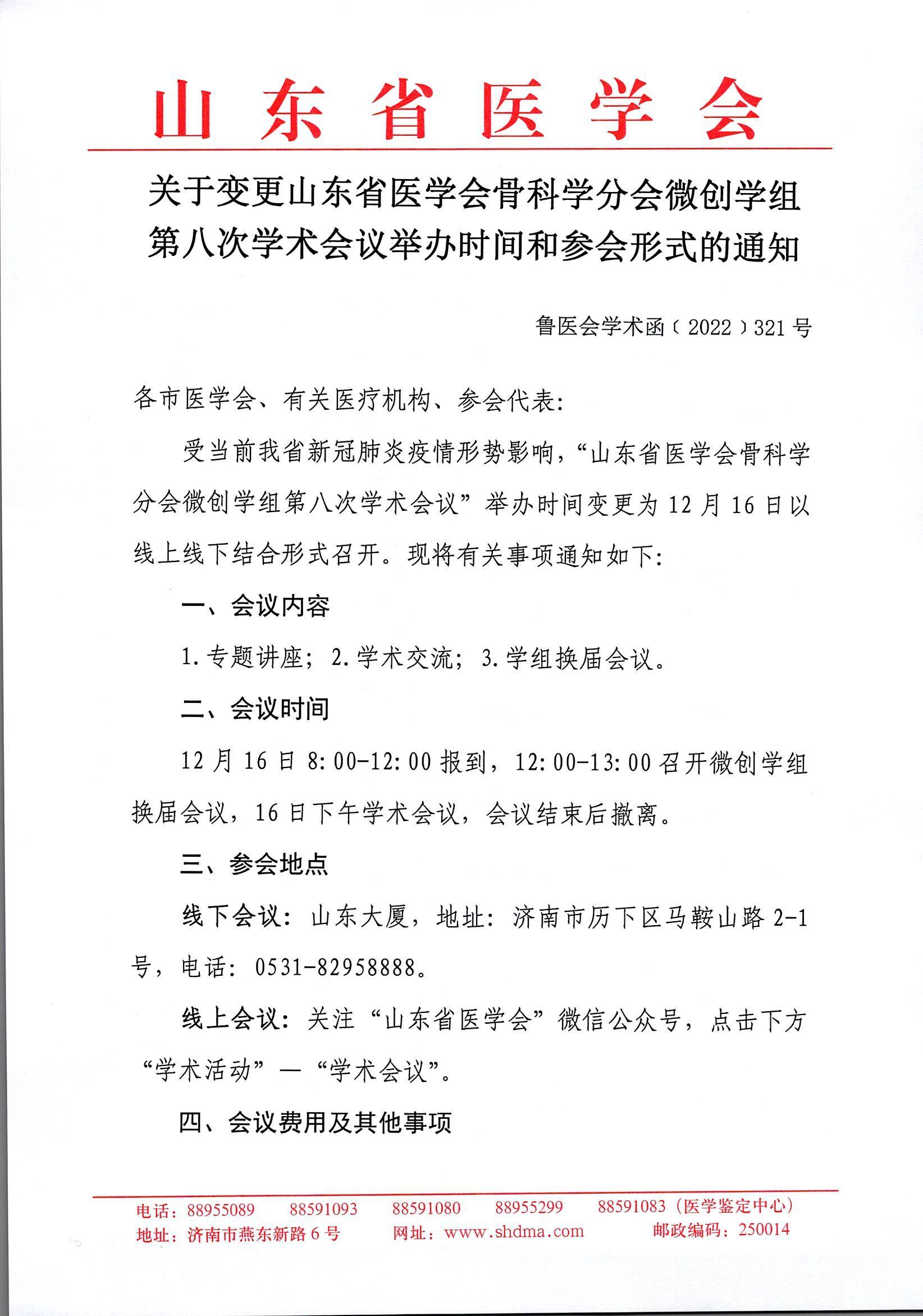关于变更山东省医学会骨科学分会微创学组第八次学术会议举办时间和举办形式的通知
