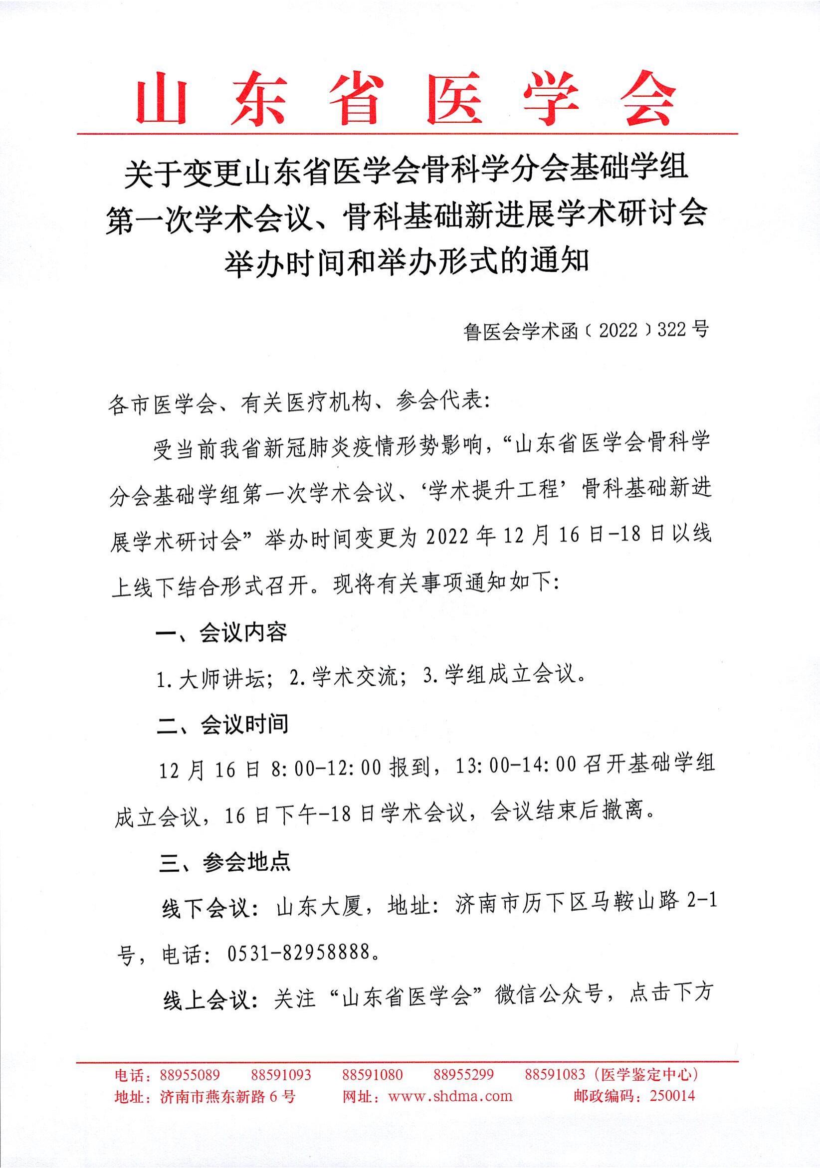 关于变更山东省医学会骨科学分会基础学组第一次学术会议、骨科基础新进展学术研讨会举办时间和举办形式的通知