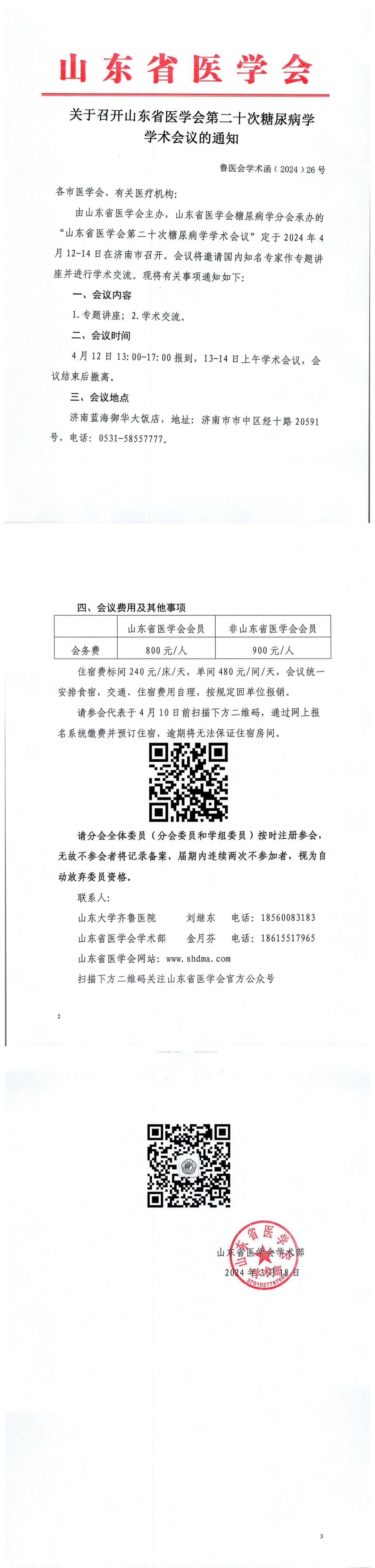 关于召开山东省医学会第二十次糖尿病学学术会议的通知