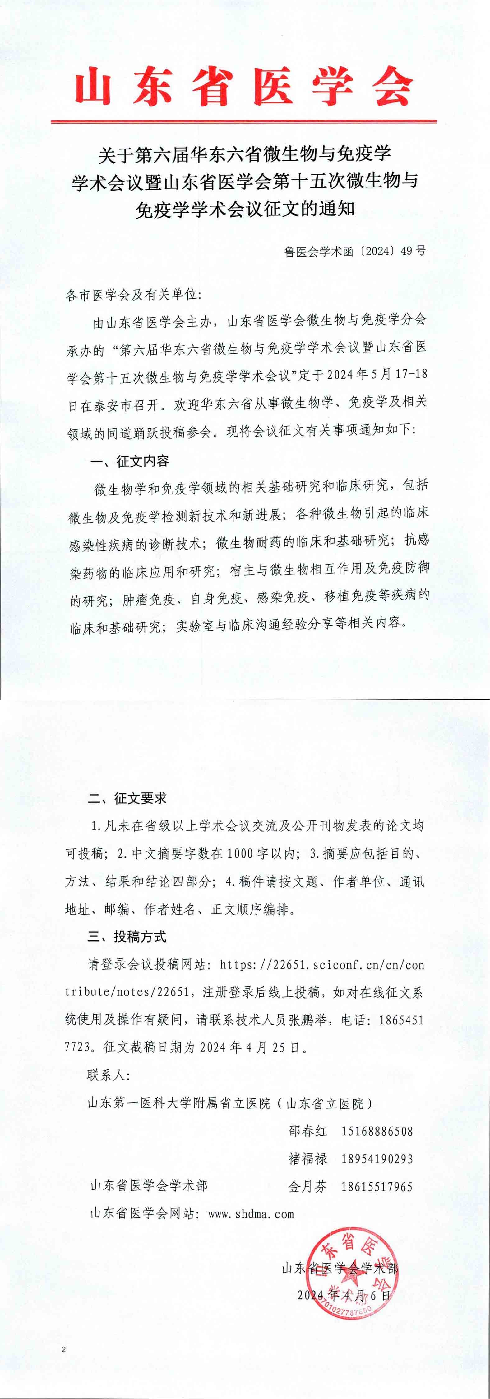 关于第六届华东六省微生物与免疫学学术会议暨山东省医学会第十五次微生物与免疫学学术会议征文的通知