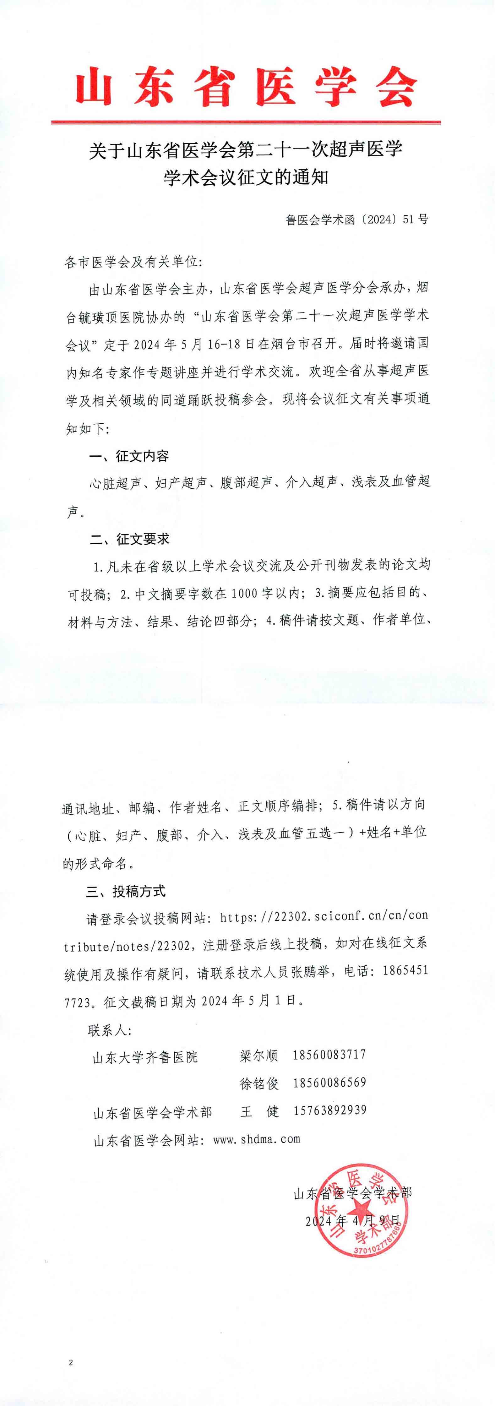 关于山东省医学会第二十一次超声医学学术会议征文的通知