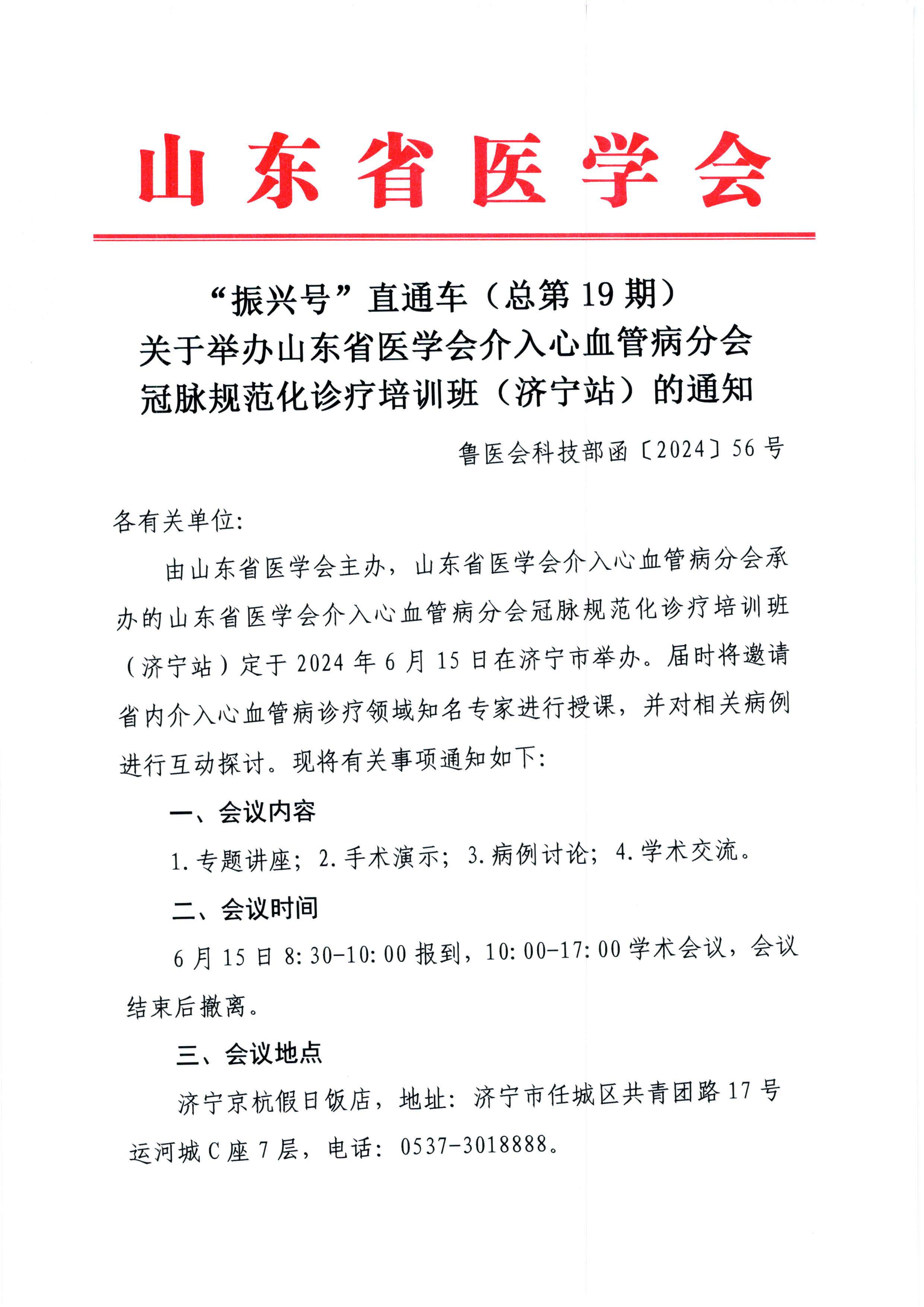 “振兴号”直通车(总第19期)关于举办山东省医学会介入心血管病分会冠脉规范化诊疗培训班(济宁站)的通知
