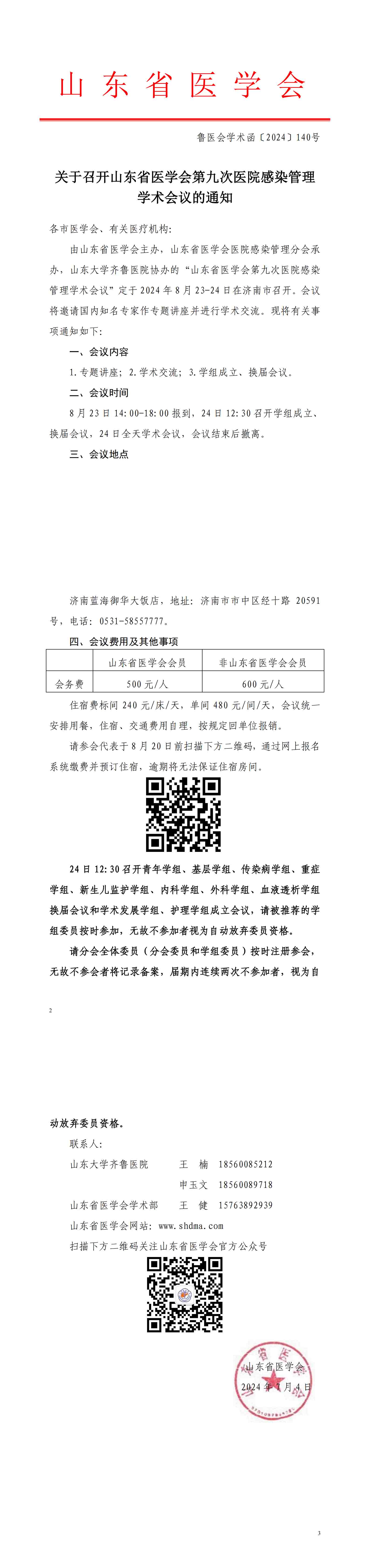 关于召开山东省医学会第九次医院感染管理学术会议的通知