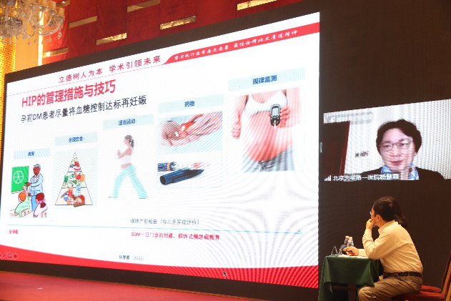 会议邀请多位国内、省内知名专家通过线上、线下方式做专题讲座。北京大学第一医院的杨慧霞讲授《不同类型高血糖孕期的管理策略》,介绍妊娠期糖尿病的定义及其分类,并根据指南证据推荐等级讲述了针对孕前不同血糖水平、孕中不同血糖水平的个体化营养管理与指导。指出不应过度强调饮食控制,仍需保持孕期营养供给,以减少母胎不良妊娠结局的发生。如饮食运动控制血糖不佳,则需胰岛素控制孕期血糖。