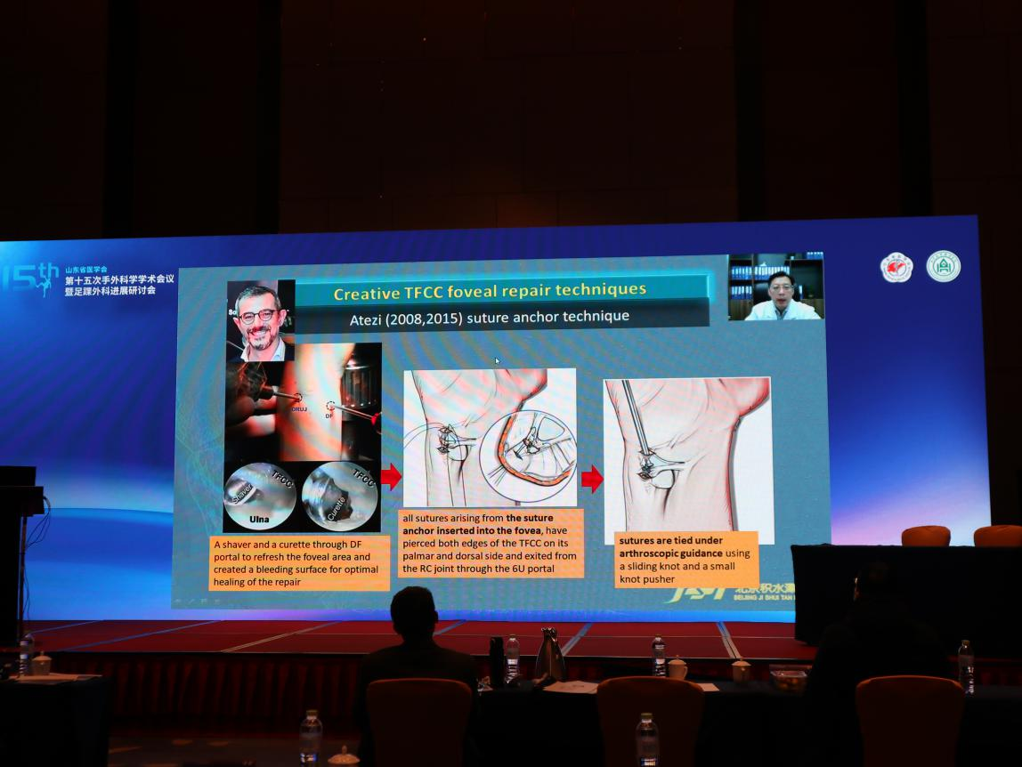 大师讲坛环节,特邀美国科罗拉多大学国际著名足踝大师Mark Myerson讲授《Managing Difficult Cavus Foot Deformities》,北京大学人民医院姜保国院士讲授《临床医学研究的创新与思考》,北京积水潭医院田文讲授《手部掌指关节人工关节成形术的有关问题》,复旦大学附属华山医院徐文东讲授《颈七交叉移位治疗中枢性偏瘫》,北京积水潭医院陈山林讲授《腕关节的困惑与思考》,复旦大学附属华山医院华英汇讲授《关节镜下踝关节外侧副韧带修补》。名师讲坛邀请朱磊和山东第一医科大学附属省立医院王增涛、青岛大学附属医院丁小珩分别进行专题讲座,既有专家常年诊治经验,又涉及最新医疗技术介绍,内容详细、令人受益匪浅,赢得代表热烈掌声。