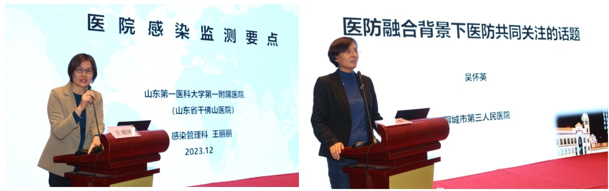 分会副主任委员、山东第一医科大学第一附院(山东省千佛山医院)感染管理科主任王丽丽和分会委员、聊城市第三人民医院医院感染管理科主任吴怀英分别从医院感染监测策略和预防与控制策略两个维度,围绕医防融合背景下感控工作重点和难点,结合实际问题和所在医院感控工作经验,从专业的角度对医院感控经验进行了分享。