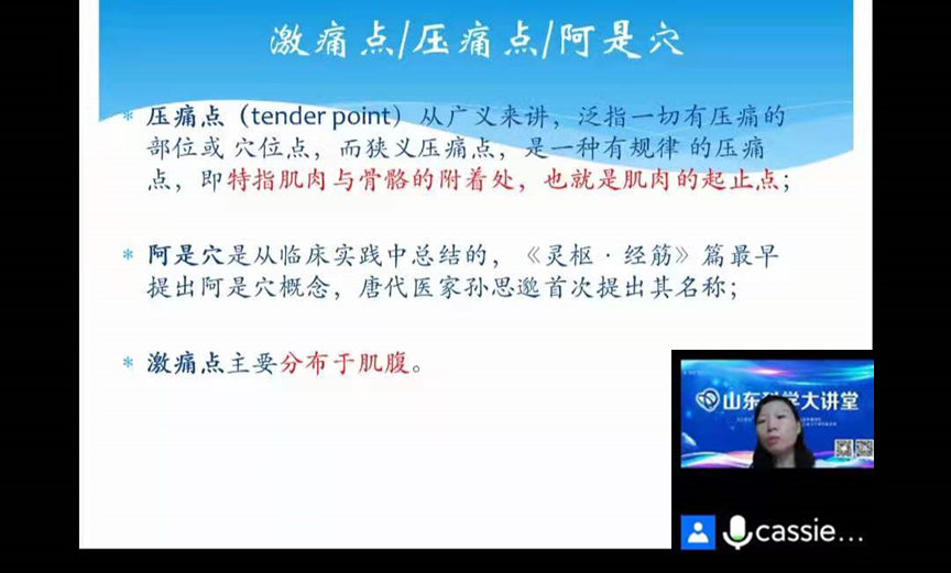 王永慧作题为“激痛点的发生与康复治疗”讲座。系统介绍了“激痛点”的发生与康复治疗,以及在日常生活和治疗中如何区分“激痛点”、“压痛点”和“阿是穴”。在面对“激痛点”时,如何选择针法,冷敷,手法治疗以及深部理疗和药物治疗等方法。