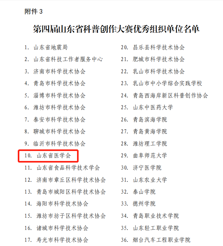 为进一步普及科学知识、弘扬科学精神,加快科普资源共建共享,推动社会各方力量参与科普创作,丰富科学传播方式和内容,促进全民科学素质提升,2021年6月省科协、省教育厅、省科技厅、省工业和信息化厅、省文化和旅游厅联合举办了“第四届山东省科普创作大赛”,我会报送的“荒春”,“扫黑风暴——与癌症斗争到底”等5个作品荣获大赛一等奖,“你好,星星的孩子”、““德尔塔”那些事”等21个作品荣获大赛二等奖,“‘甜蜜’的诱惑”、“小产疑云”等33个作品荣获大赛三等奖。我会获“优秀组织单位”称号。