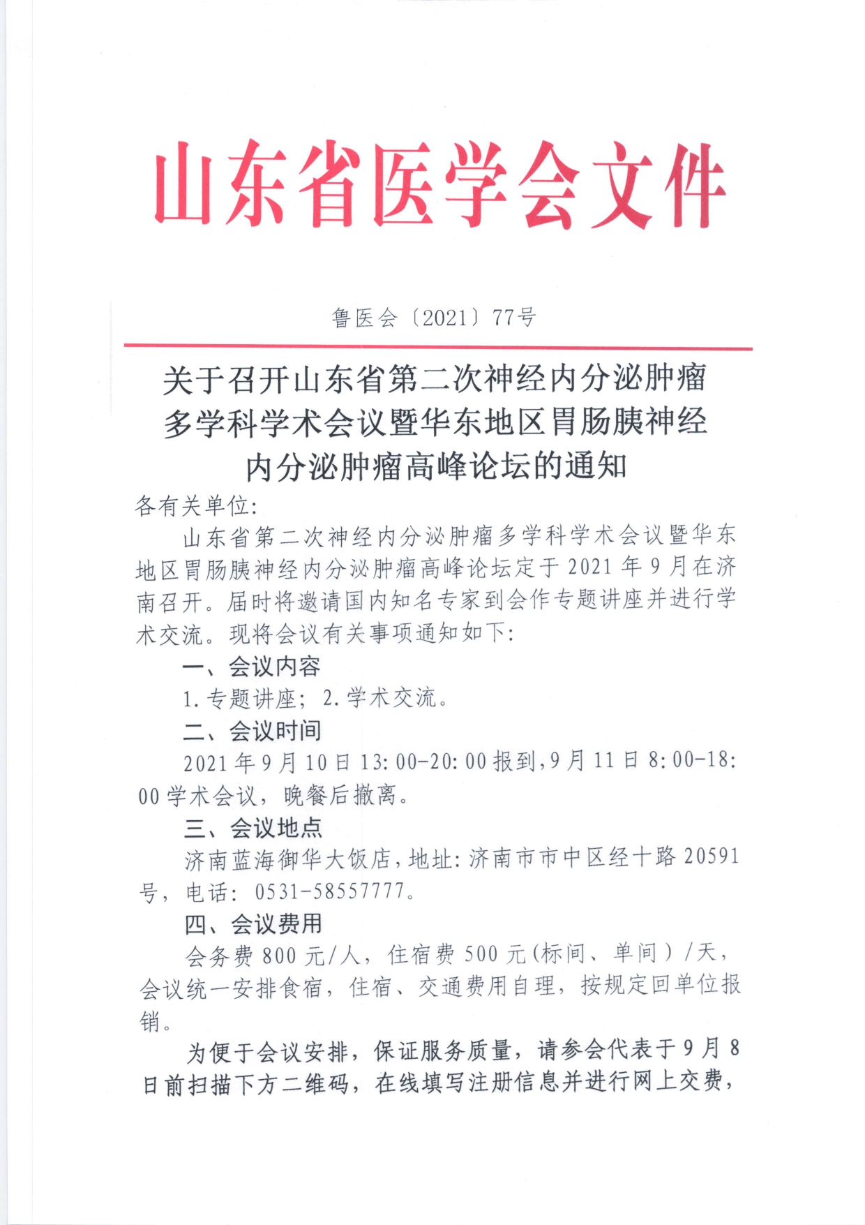 关于召开山东省第二次神经内分泌肿瘤多学科学术会议暨华东地区胃肠胰神经内分泌肿瘤高峰论坛的通知