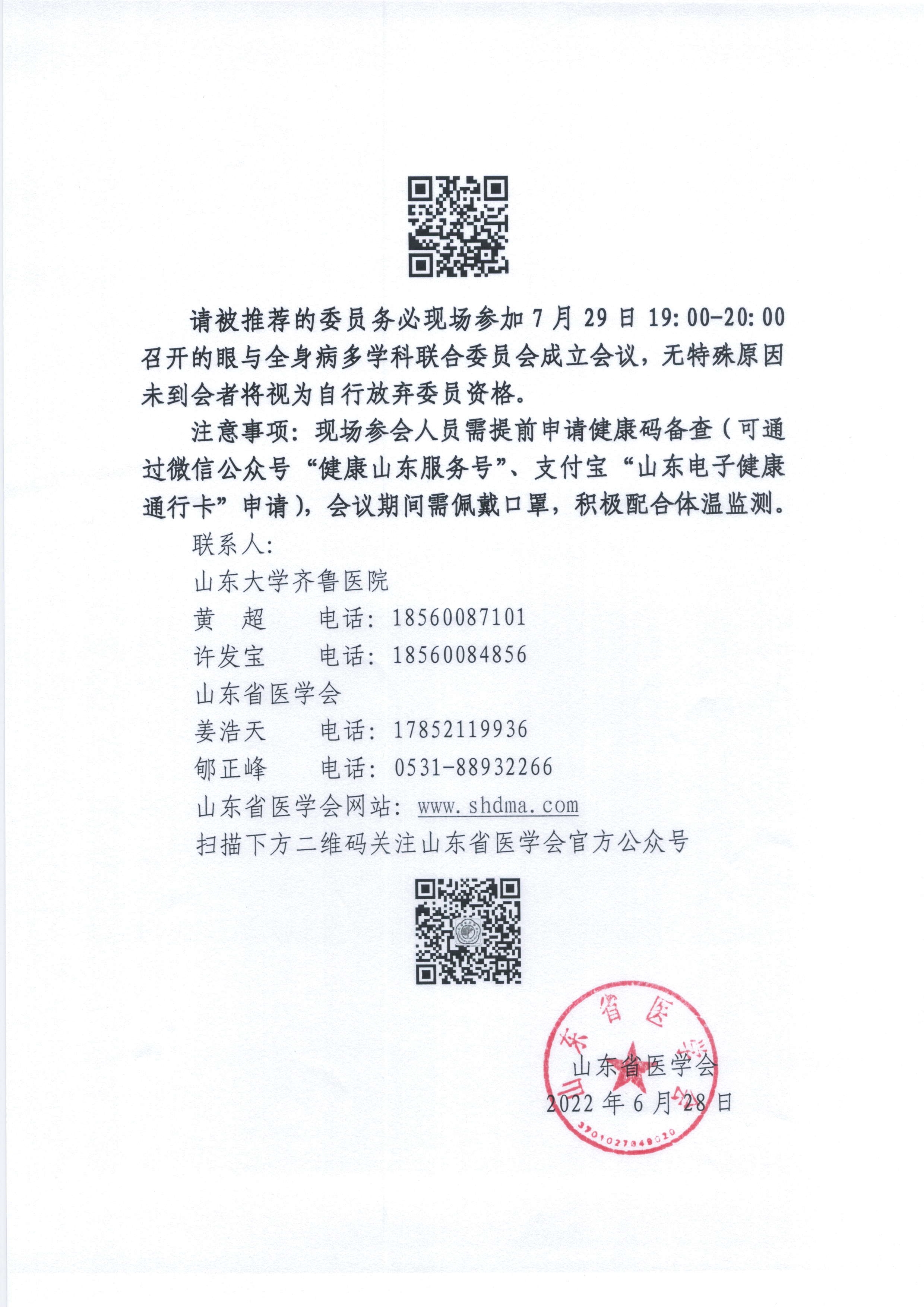 关于召开山东省医学会眼与全身病多学科联合委员会成立会议暨首次学术研讨会的通知