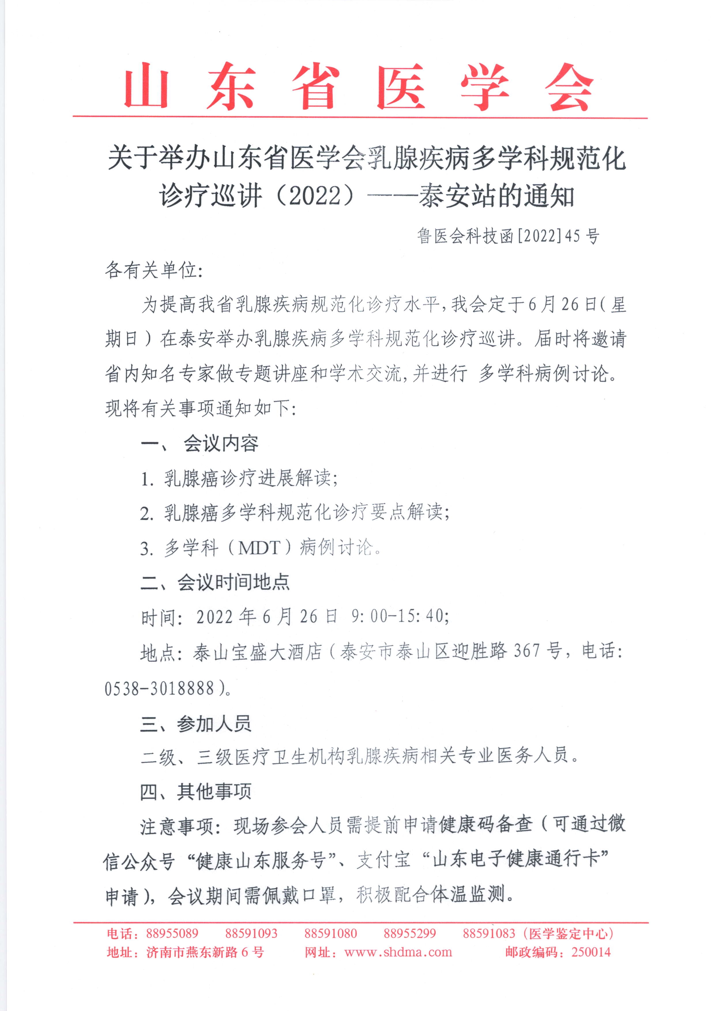 关于举办山东省医学会乳腺疾病多学科规范化诊疗巡讲(⒛22)--泰安站的通知