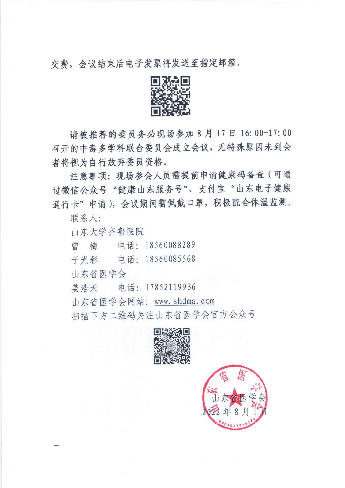 关于召开山东省医学会中毒急危重症多学科联合委员会成立会议暨首次学术研讨会的通知