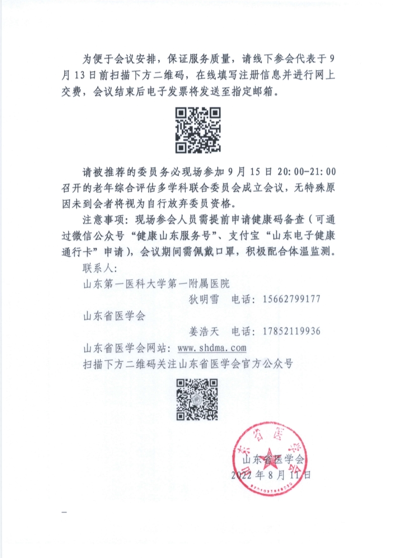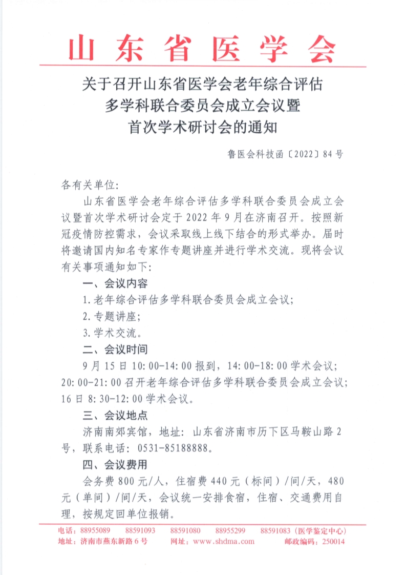 关于召开山东省医学会老年综合评估多学科联合委员会成立会议暨首次学术研讨会的通知