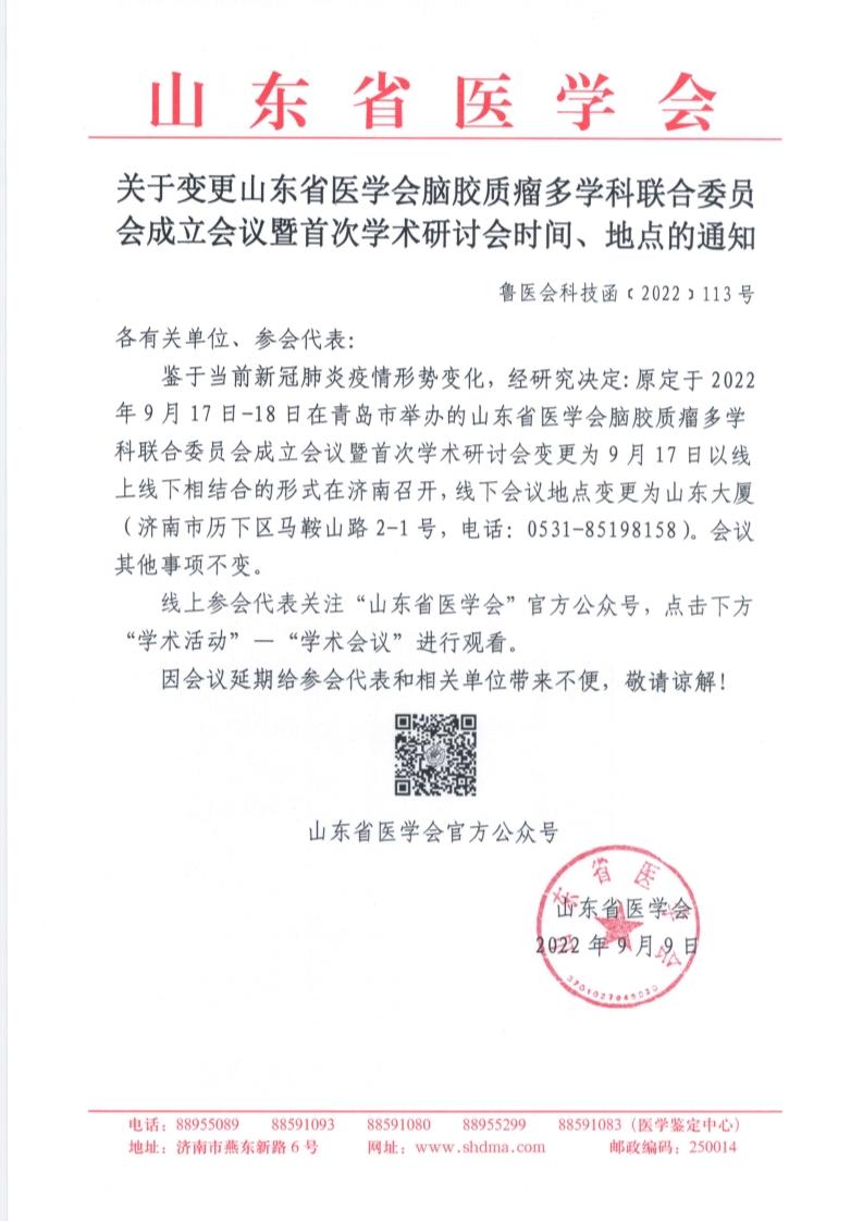 关于变更山东省医学会脑胶质瘤多学科联合委员 会成立会议暨首次学术研讨会时间、地点的通知