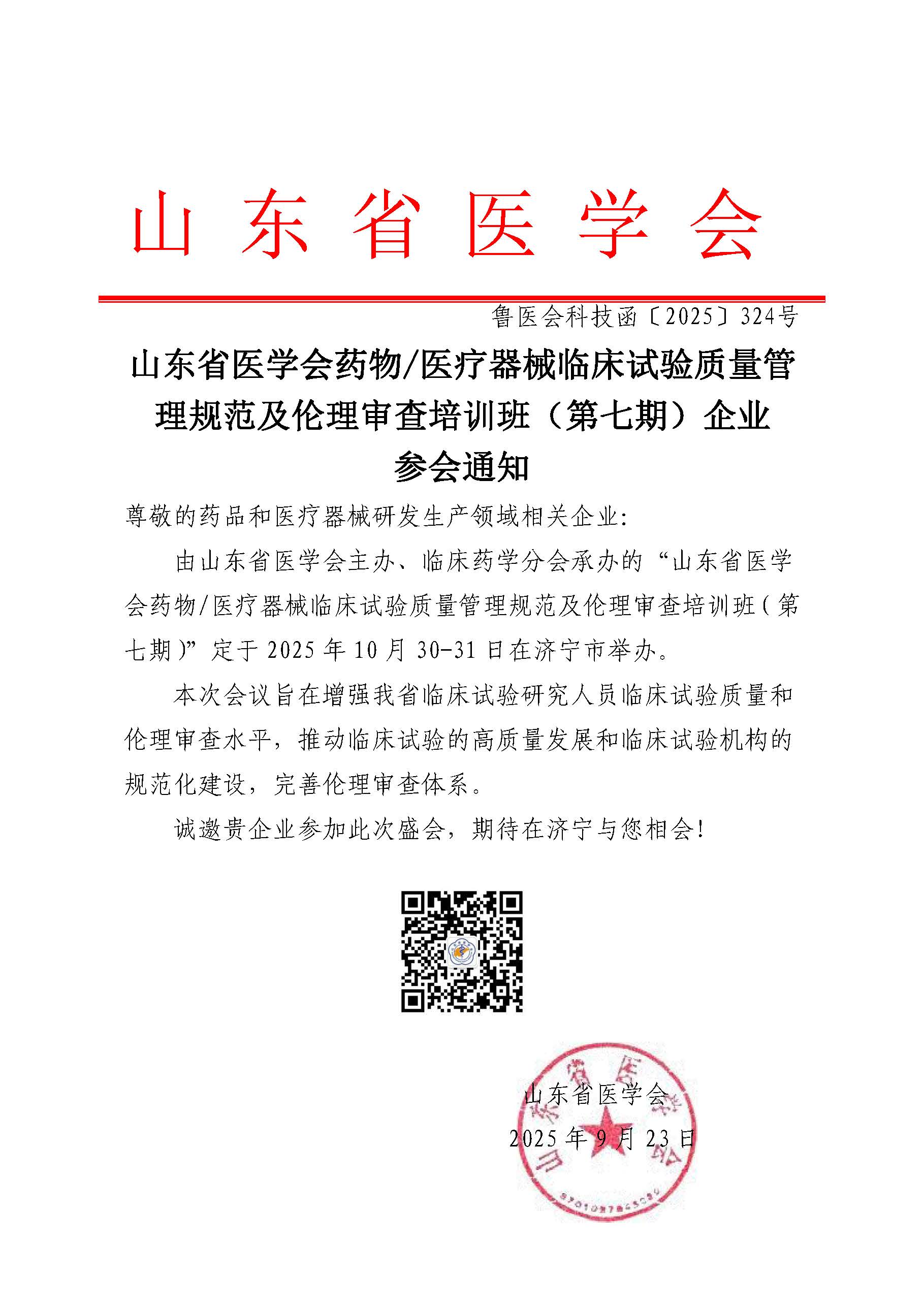 山东省医学会药物 医疗器械临床试验质量管理及伦理审查培训班(第七期)企业参会通知
