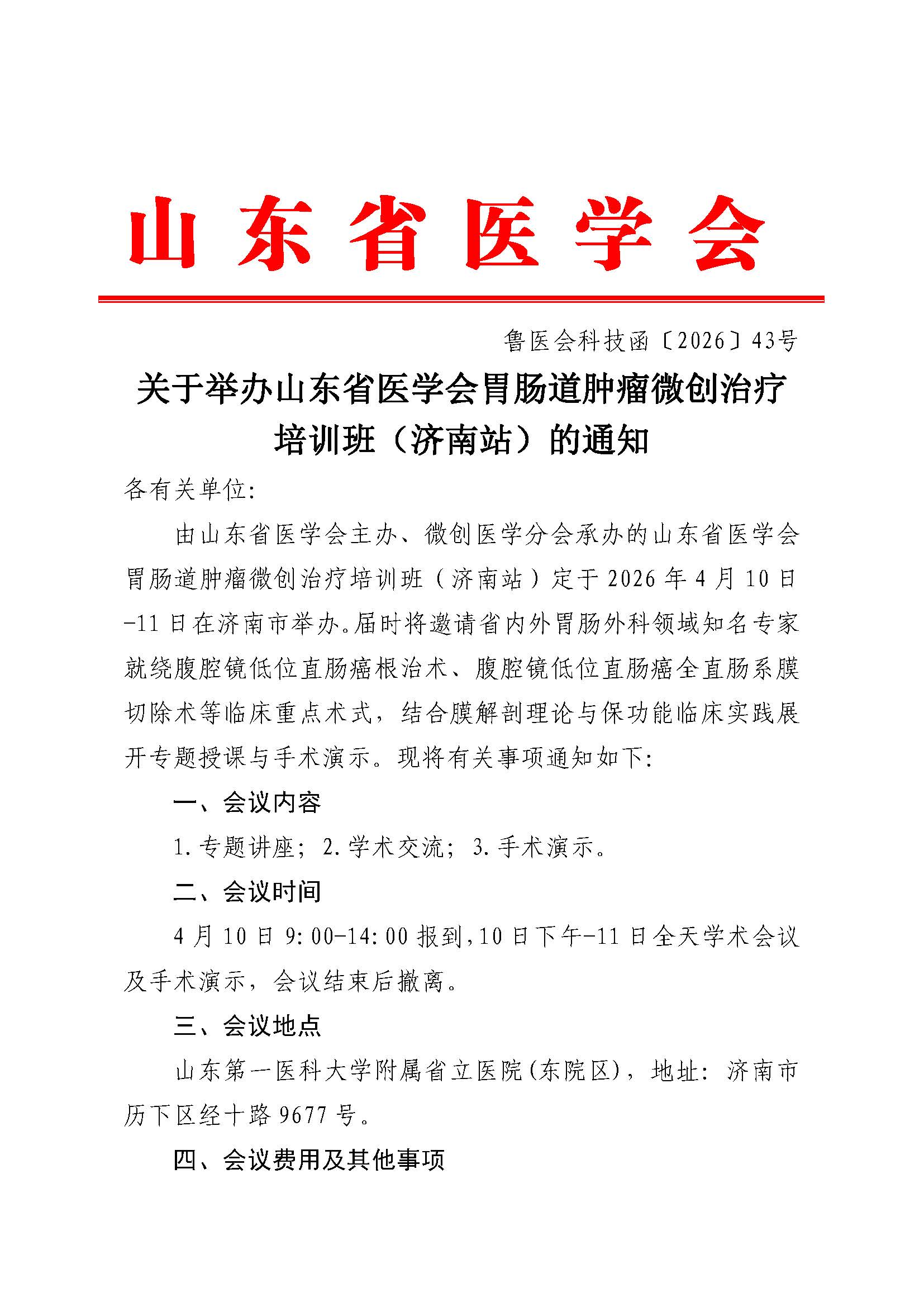 关于举办山东省医学会胃肠道肿瘤微创治疗培训班(济南站)的通知