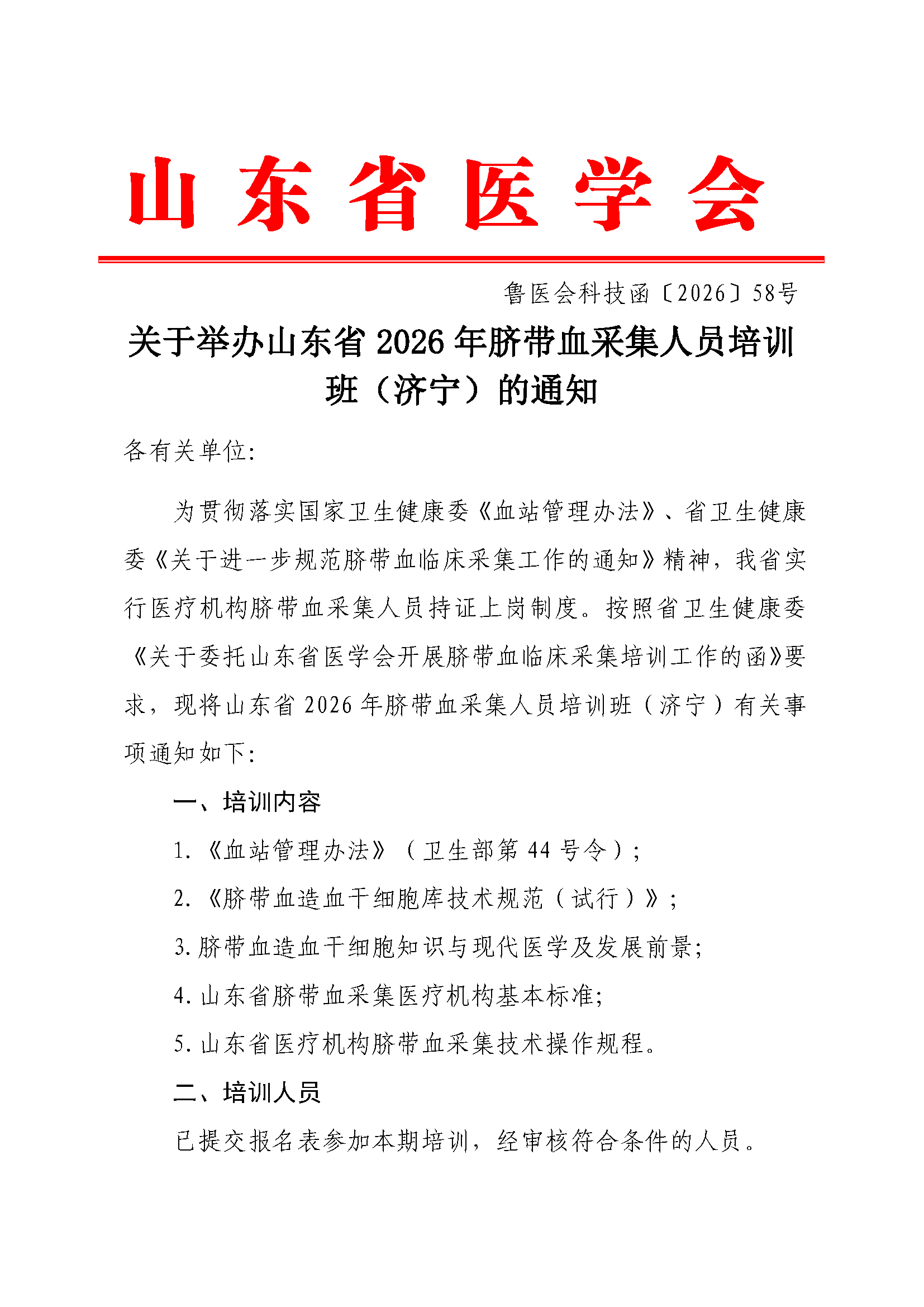 关于举办山东省2026年脐带血采集人员培训班(济宁)的通知