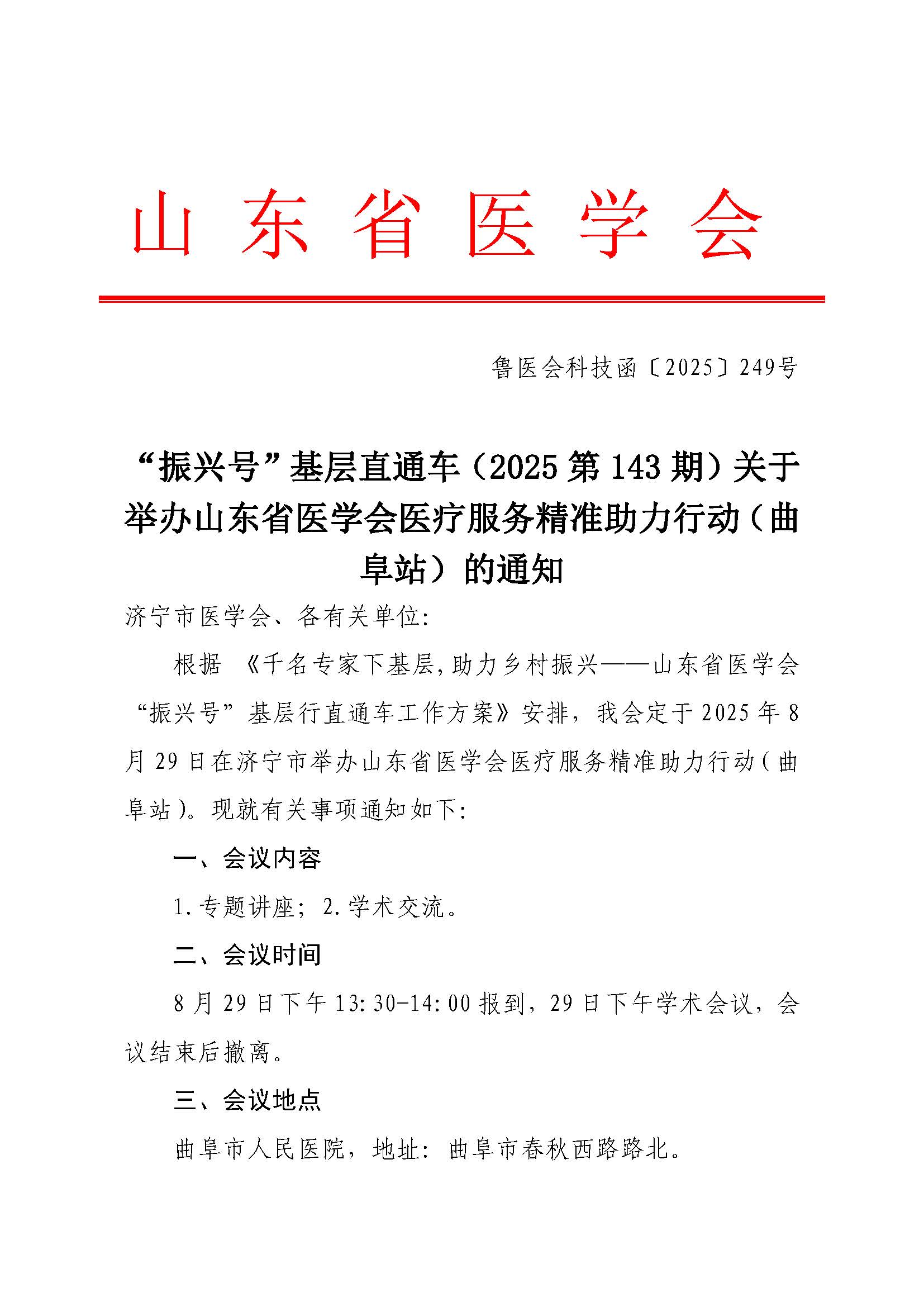"振兴号"基层直通车(2025第143期)关于举办山东省医学会医疗服务精准助力行动(曲阜站)的通知