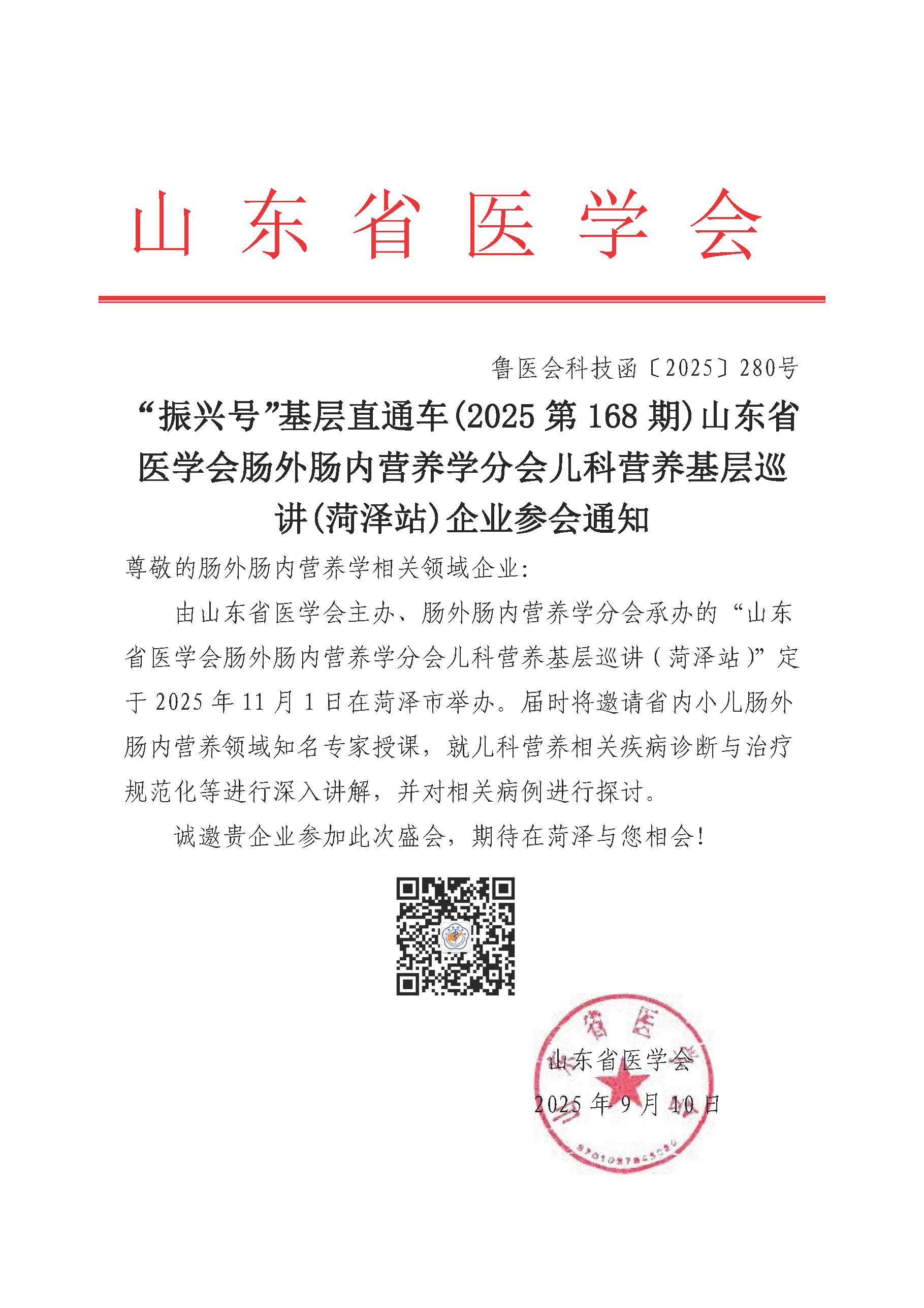 “振兴号”基层直通车(2025第168期)山东省医学会肠外肠内营养学分会儿科营养基层巡讲(菏泽站)企业参会的通知