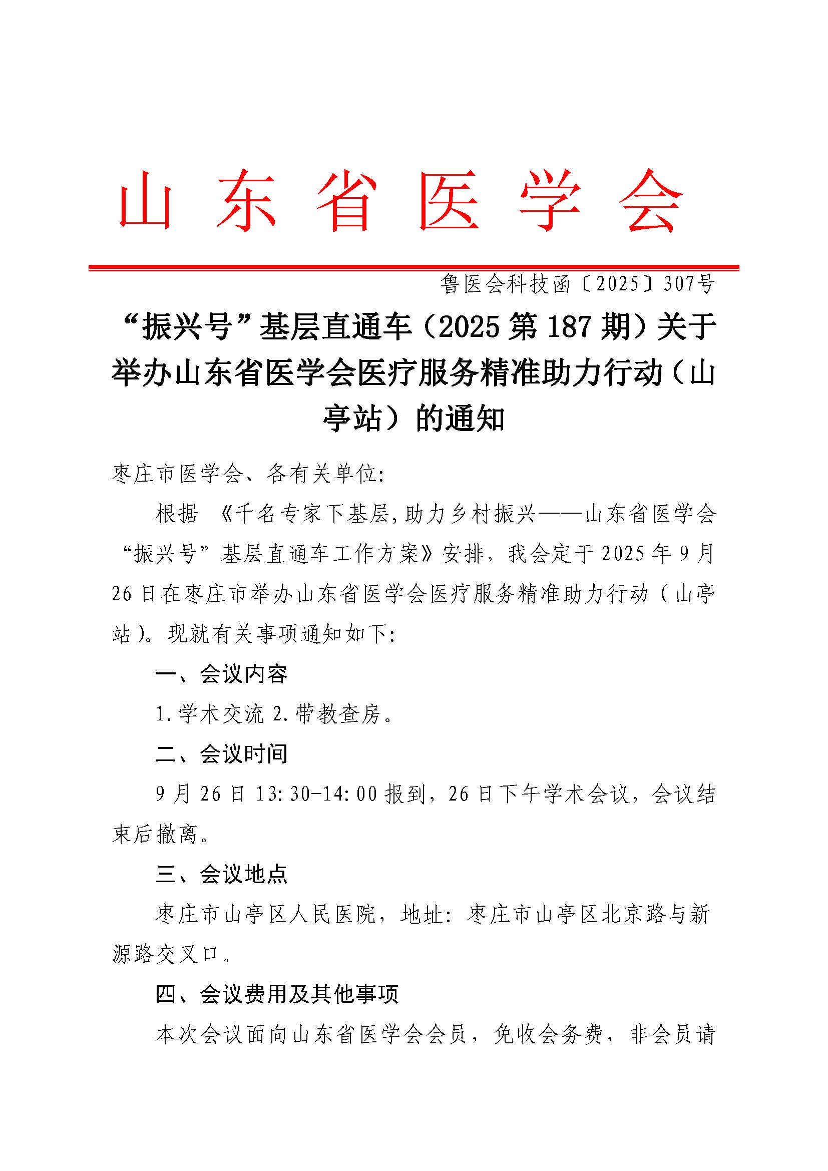 “振兴号”基层直通车(2025第187期)关于举办山东省医学会医疗服务精准助力行动(山亭站)的通知