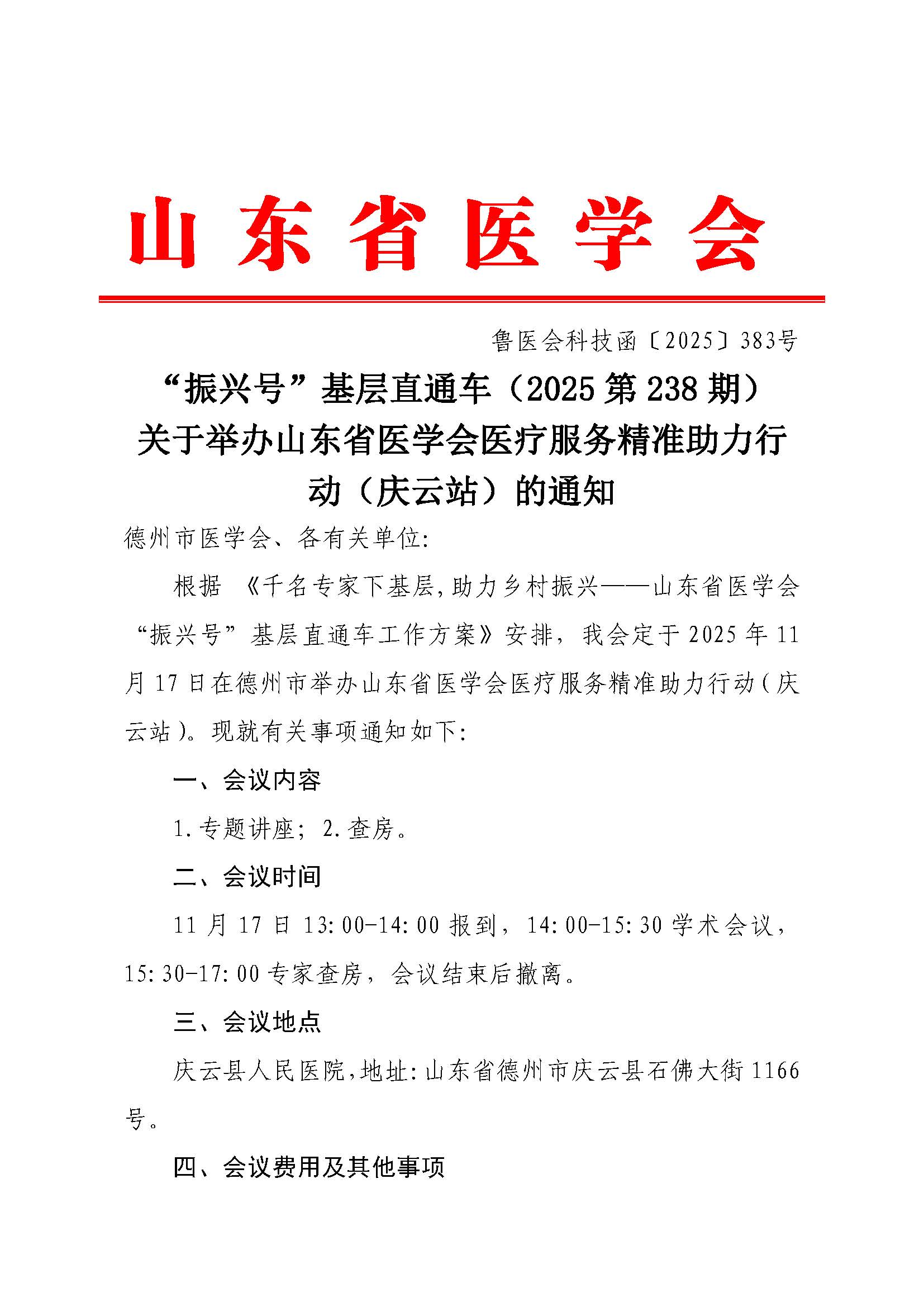 “振兴号”基层直通车(2025第238期)关于举办山东省医学会医疗服务精准助力行动(庆云站)的通知