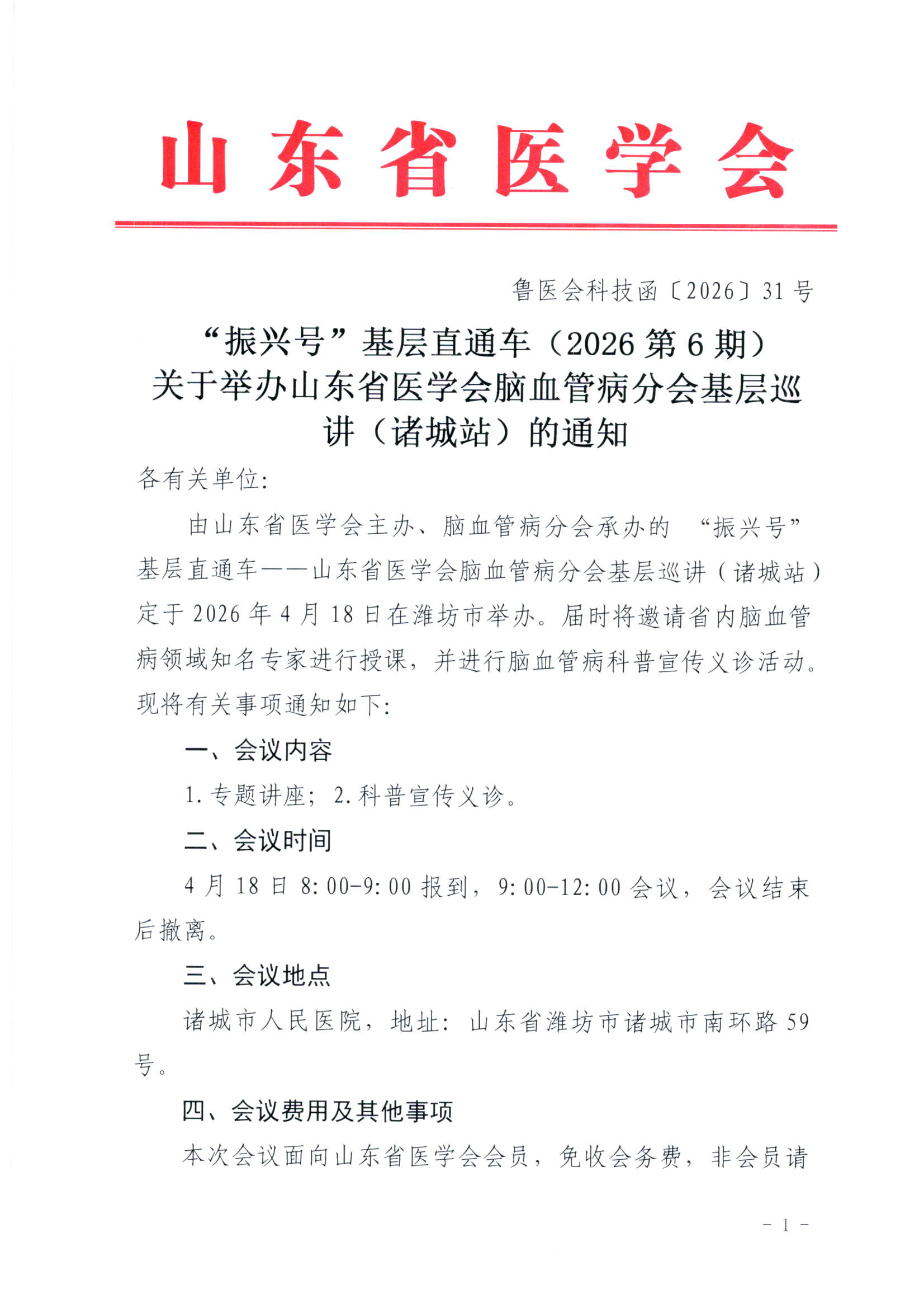 “振兴号”基层直通车(2026第6期)关于举办山东省医学会脑血管病分会基层巡讲(诸城站)的通知