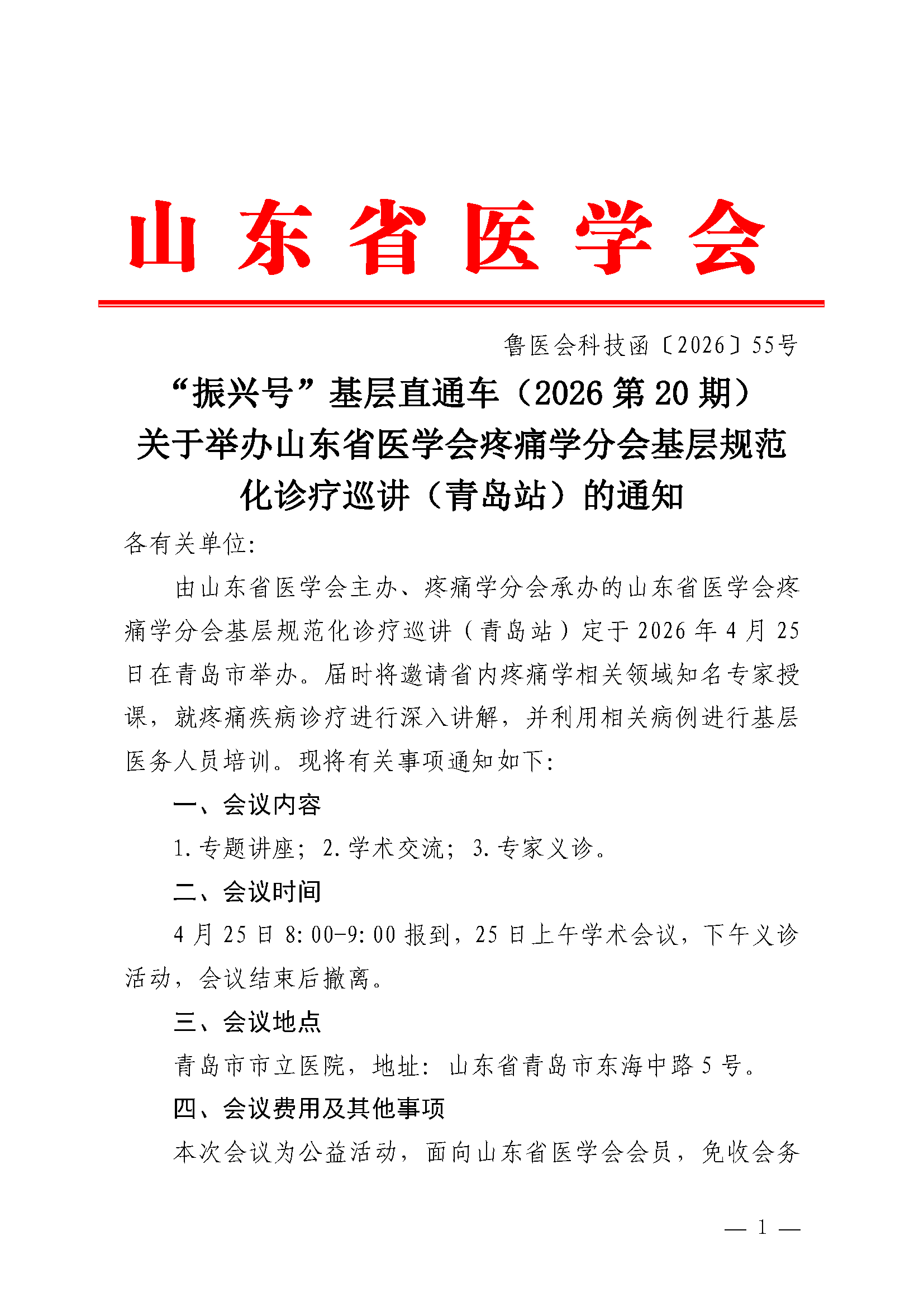 “振兴号”基层直通车(2026第20期)关于举办山东省医学会疼痛学分会基层规范化诊疗巡讲(青岛站)的通知