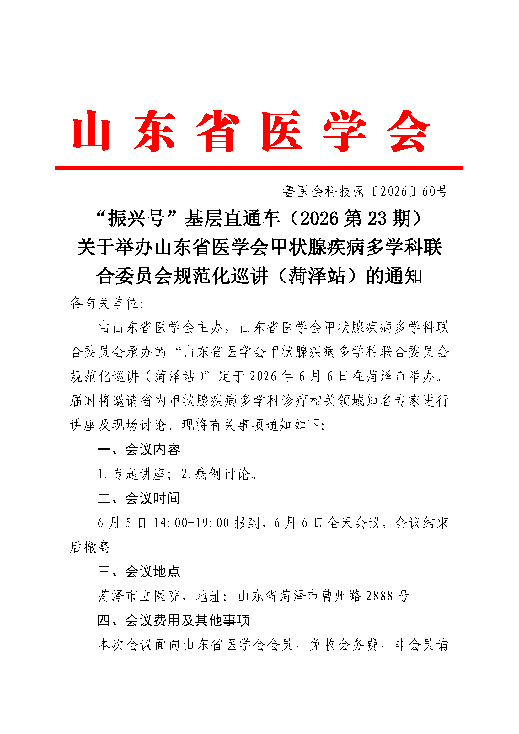 “振兴号”基层直通车(2026第23期)关于举办山东省医学会甲状腺疾病多学科联合委员会规范化巡讲(菏泽站)的通知
