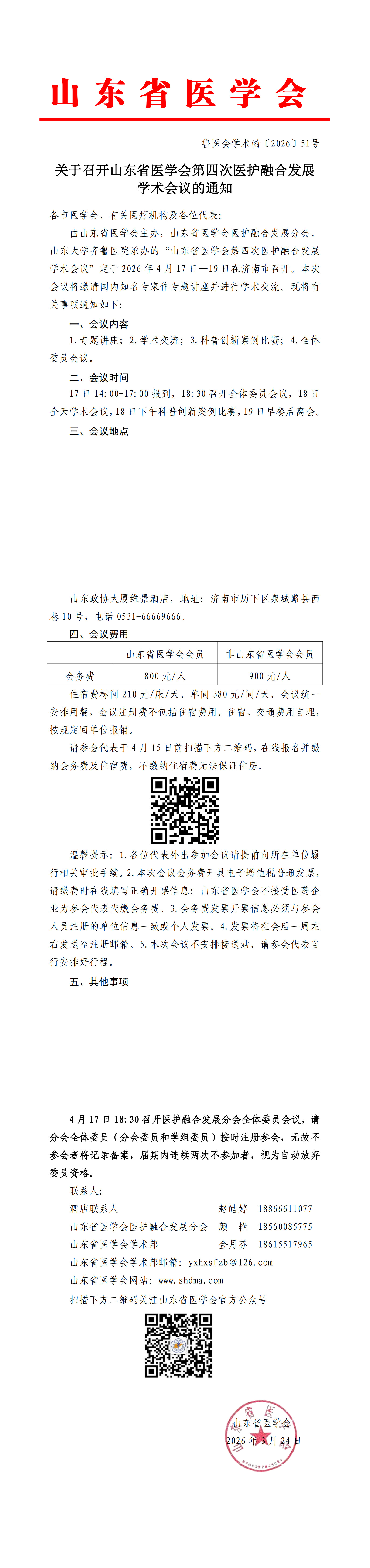 关于召开山东省医学会第四次医护融合发展学术会议的通知